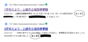 「倉上昊志 中学」と検索すると、城西中学校の2020年、2022年の『学年だより』に名前が出るためです。