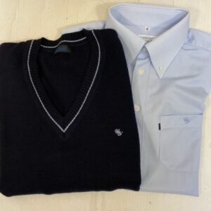 - セーターの首元にブルーのラインが入っている